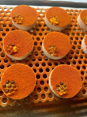 My last few weeks at Disfrutar felt like a dream. I was finally placed at the station I had always hoped to see: pastry. The pastry station is located at the front of the restaurant and has a bar where guests can dine. The workload was different, the tasks were more intriguing, and the Chefs de Partie trusted me much more. I was able to assist with some ice cream prep, became very comfortable working with liquid nitrogen, and used my quenelling skills to work with and polish many molds for their chocolate creations. One of the coolest techniques I saw in pastry involved using nixtamalization to create a warm disc of praline with a gooey chocolate center. At Californios, nixtamalization is no foreign technique—calcium hydroxide is at the core of Mexican cuisine. It’s what gives us tortillas! But using calcium hydroxide in this new way was eye-opening and I am very excited to incorporate it with California produce.