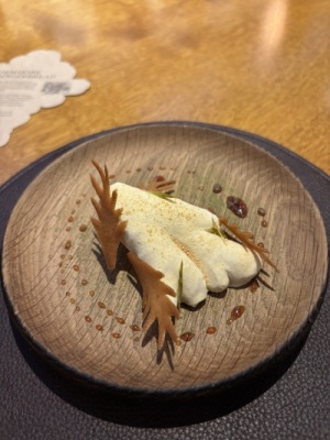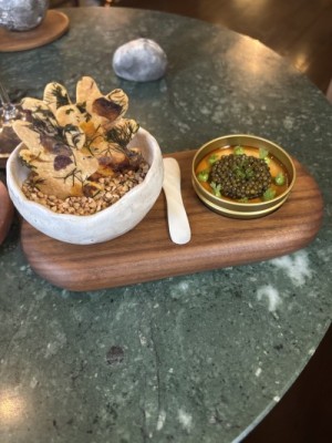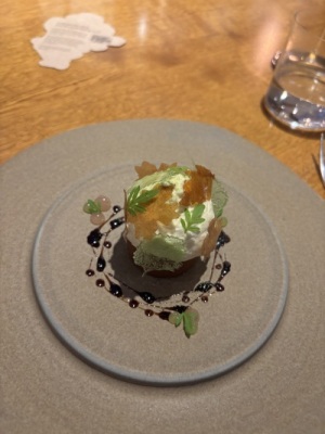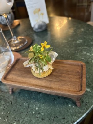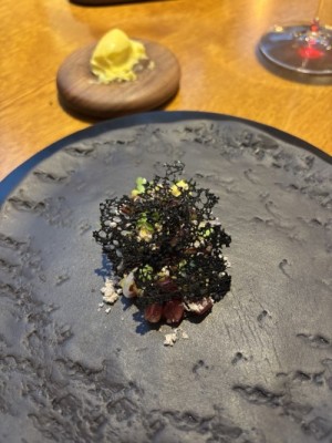 When it came to service, I started on plating the final snack that was served in the kitchen before guests were seated to begin their plated courses. To say it was a meticulous endeavor to build this snack would be an understatement. To start, it was a spiralized potato that was first poached in hot water, then wound into a small basket, and finally fried. Piped into this potato basket was a brandade of smoked eel, then some black garlic purée was piped into the middle of the brandade, followed by pickled shallots and chives on top. Finally, the brandade was covered with viola flowers. Each petal had to be sticking out slightly so that, rather than looking ‘smooshed,’ it had a ‘lively’ appearance. After being inspected by the chefs, it was placed on a skewer at the pass, and the waiter, after they finished the kitchen tour, surprised the guests with it.