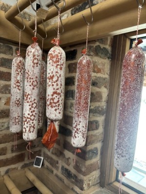 Everything that was prepped or plated was inspected by a sous chef or head chef. All stocks, sauces, knife cuts, purées, vegetable prep (i.e., anything that was made by the cooks) had to be checked off prior to service. I found this to be a big factor in how Moor Hall was able to keep its standards consistent. It was also a first for me to see this kind of standard enacted in a kitchen. After about three to four weeks, one of the sous chefs offered me the chance to assist him with butchering a half pig and turning it into various charcuterie items. This experience was one of my biggest takeaways as I previously had not had a lot of opportunity to work with charcuterie making. Learning how to best approach breaking down the various muscles, to curing, grinding, mixing, aging, etc. was incredibly insightful. We made Coppas, Lonza, Peppered leg, and 2 varieties of salumi (black pepper and fennel-garlic).