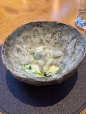 As time went on, they had me plating the first dish once guests sat down. This consisted of aged Bluefin tuna from Cornwall, dressed in a soy dressing with citrus oil. In the bottom of the bowl was a nasturtium purée seasoned with horseradish and lime juice, with tuna placed on top to hide the green purée. Once the guest was in the kitchen, the dish would be finished with a tomato ponzu dressing, purple radish, and finely chiffonaded and fried kombu basket.